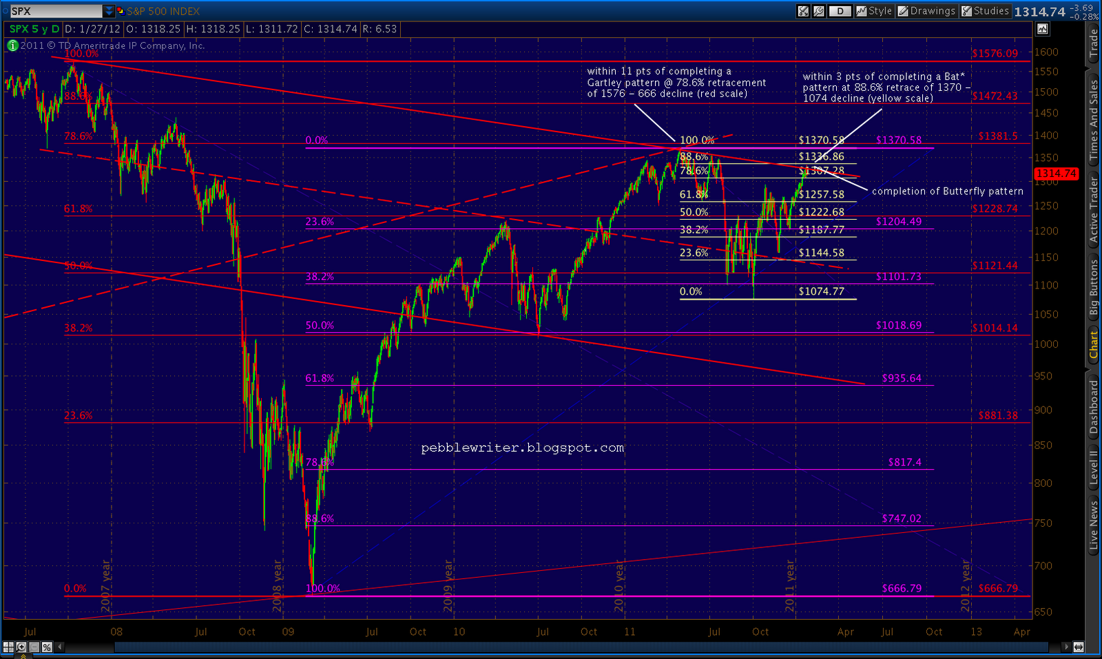 In addition to the Crab pattern that completes at 1289, we've now formed most of a Gartley that points to the same level -- shown below in purple. Keep in mind that, because it's just shy of the .618 reversal for Point B, it could also qualify as a Bat or a Crab -- which would take it to the .886 (at 1283) or the 1.618 (at 1242) respectively.