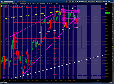 Looking at the cash market, the level at which we open matters a lot. If we exceed 1354.32, the H&S pattern craps out -- not the end of the world for bears, but it changes the count a bit. Many EW practitioners have been calling for a slightly higher 5th wave to end Minor 2. As long as we stay below 1370, all is well in Elliott World.